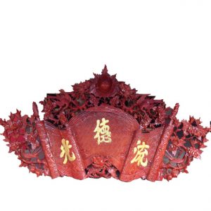 Câu đối và cuốn thư được đục kênh bong cực kỳ tinh tế và chi tiết. Tất cả đều đạt đến độ tinh tế và hoàn thiện rất cao. Phần cuốn thư được đục sâu với hình tượng nổi trội là rồng phượng chầu , các bên cánh gà của bức cuốn thư cũng được đục cực kỹ với họa tiết chủ đạo là rồng phượng và hoa Mai.