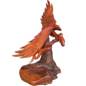 Gỗ xà cừ cổ thụ. Đảm bảo nguyên khối. Tượng được đục hoàn toàn thủ công, lắp ráp 2 cánh bằng vít chắc chắn có thể điều chỉnh được. 2 cánh đại bàng được chiện từ tấm gỗ thịt xà cừ, uốn khéo léo cho cảm giác mềm mại sống động như thật.