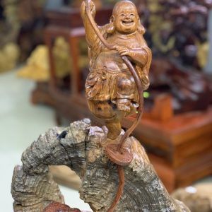 Tượng phật Di Lặc đứng tiền gỗ Hương là biểu tượng cho sự vui vẻ, hồn nhiên, sự tự do và những điều tốt đẹp của cuộc sống.