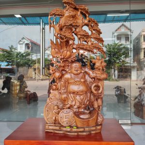 Tượng khắc họa hình ảnh quen thuộc phổ biến nhưng vẫn rất cuốn hút của vị Phật cười Di Lặc. Chân đứng ngộ nghĩnh, đứng dưới gốc tùng. Một tay vác cành đào. Bên trên là chú tiểu đồng đang đứng với nụ cười vô cùng hồn nhiên. Toàn bộ bức tượng toát ra vẻ viên mãn, hoàn hảo, hạnh phúc, thịnh vượng ngập tràn. Bên dưới là hình ảnh ngài đứng trên những thỏi vàng vô cùng lớn. Những chú tiểu đồng đang nô đùa.