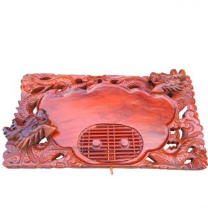 Khay trà gỗ được đục trên phiến gỗ gõ đỏ cực quý. Màu đỏ tươi lịch lãm, mùi hương dịu dàng dễ chịu.