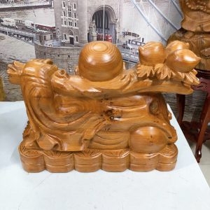 Tượng Di Lặc vác đào được đục hoàn toàn thủ công trên gỗ ngọc am cao cấp, đảm bảo liền khối. Tượng Di Lặc mang tư thế vui vẻ, ngộ nghĩnh, ung dung oai vệ ngồi trên thiềm vàng. Tay trái vác cành đào trường thọ, tay phải cầm thỏi vàng. Biểu tượng cho sự đủ đầy, sung túc của gia chủ.