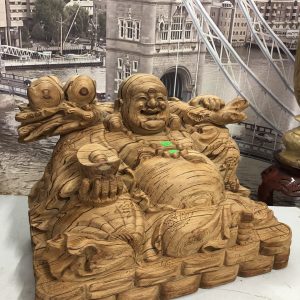 Tượng được làm trên chât liệu gỗ ngọc am lâu năm. Khăc họa một cách chi tiết Đức phật Di Lặc đang ngồi nở nụ cười vô cùng phúc hậu trên thiềm vàng. Biểu tượng cho sự bình an, hạnh phúc. Tay phải cầm thỏi vàng thể hiện sự giàu sang phú quý. Tay trái vác cành đào biểu tượng cho hạnh phúc, sức khỏe và trường sinh.