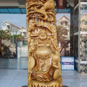 Tượng khắc họa hình ảnh quen thuộc phổ biến nhưng vẫn rất cuốn hút của vị Phật cười Di Lặc. Chân đứng ngộ nghĩnh, đứng dưới gốc tùng. Một tay cầm chiếc gậy như ý, một tay cầm đồng tiền vàng. Bên trên là các chú tiểu đồng đang đứng với nụ cười vô cùng hồn nhiên. Toàn bộ bức tượng toát ra vẻ viên mãn, hoàn hảo, hạnh phúc, thịnh vượng ngập tràn.